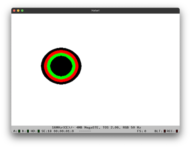 This only shows 4 colours due to ST-Medium resolution. ST-Low should show the full 8, but I use mono when developing so more text can fit on screen at once - that just shows a single black circle.